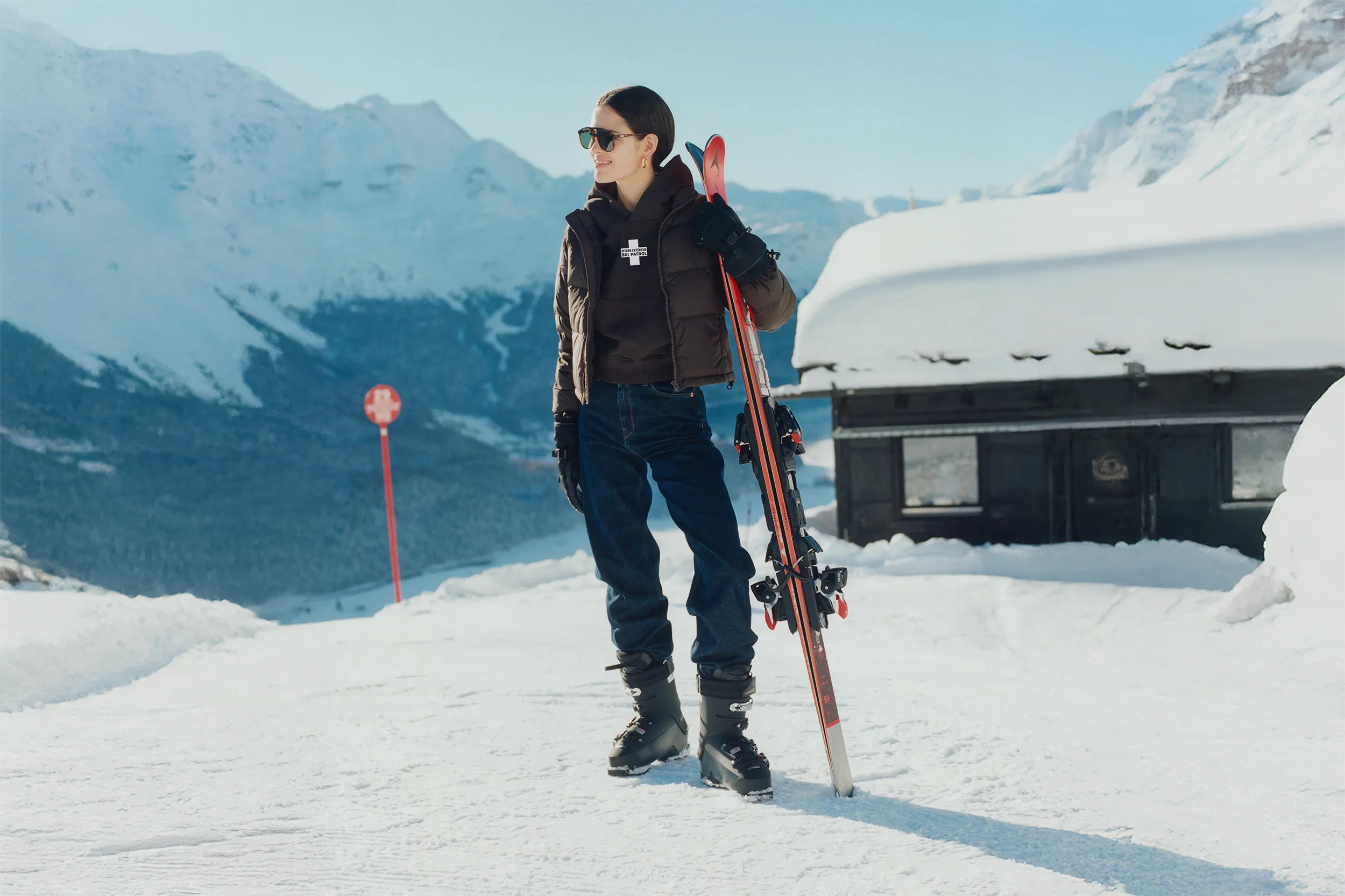 Après-Ski Society® header image: Person with skis standing on a snowy mountain with a cabin in the background