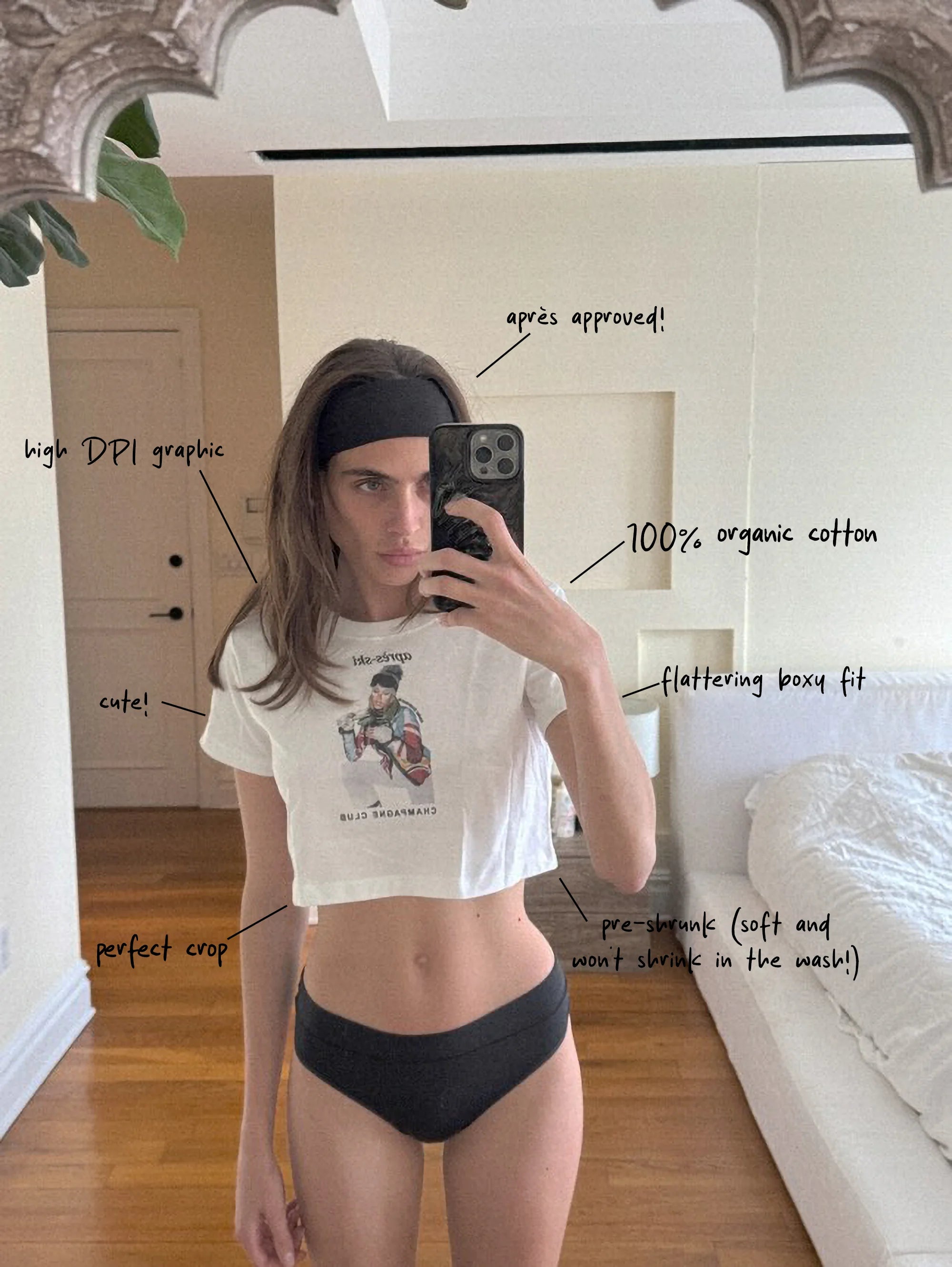 A cropped silhouette with a nod to ‘90s snowboard graphics. Cut from soft cotton jersey, it balances sport heritage with a clean, modern line. Lightweight, easy, and made for layering on or off the slopes.